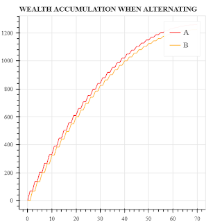 I showed how using a Thue-Morse sequence for multiple people sharing gave a "fairer" distribution of wealth, for example this graph of accumulated wealth for three people: