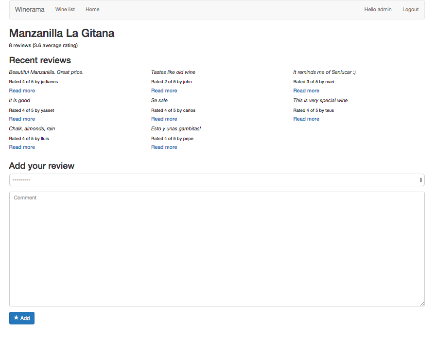 With this, we can navigate to any wine detail page (e.g. http://KODIG_USERNAME:8000/reviews/wine/1/) and add a new review. Don’t worry too much about the page not being very attractive. We will solve this in the next two sections.